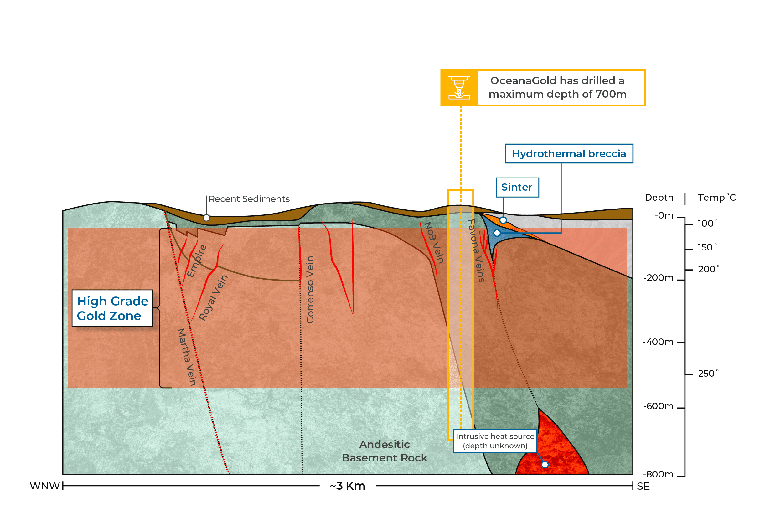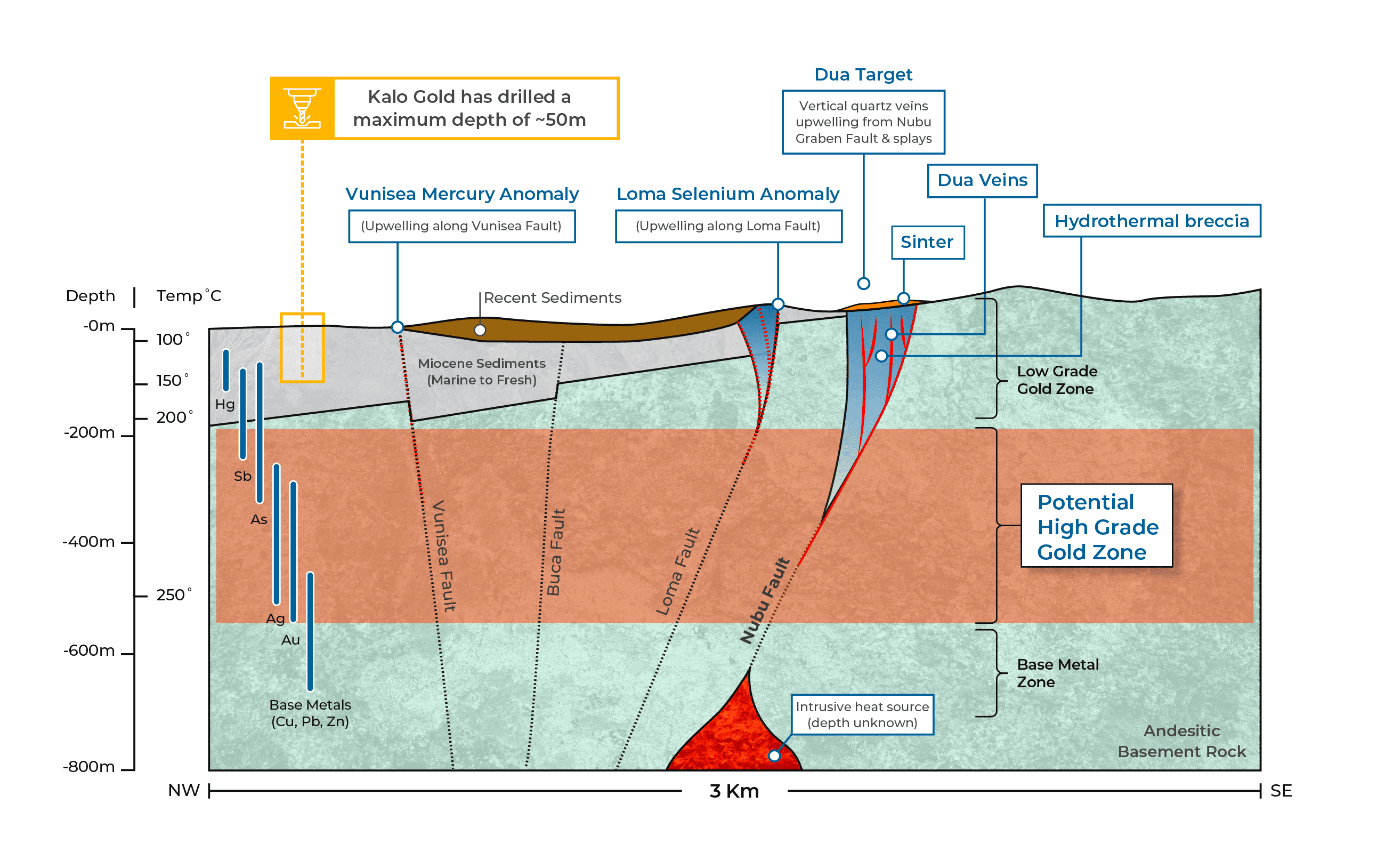 Conceptual section demonstrating the formation of key structures within the Vatu Aurum Project, and the magma upwelling zones, diatremes and a large back arc basin contributing to contributing to mineralizing events.