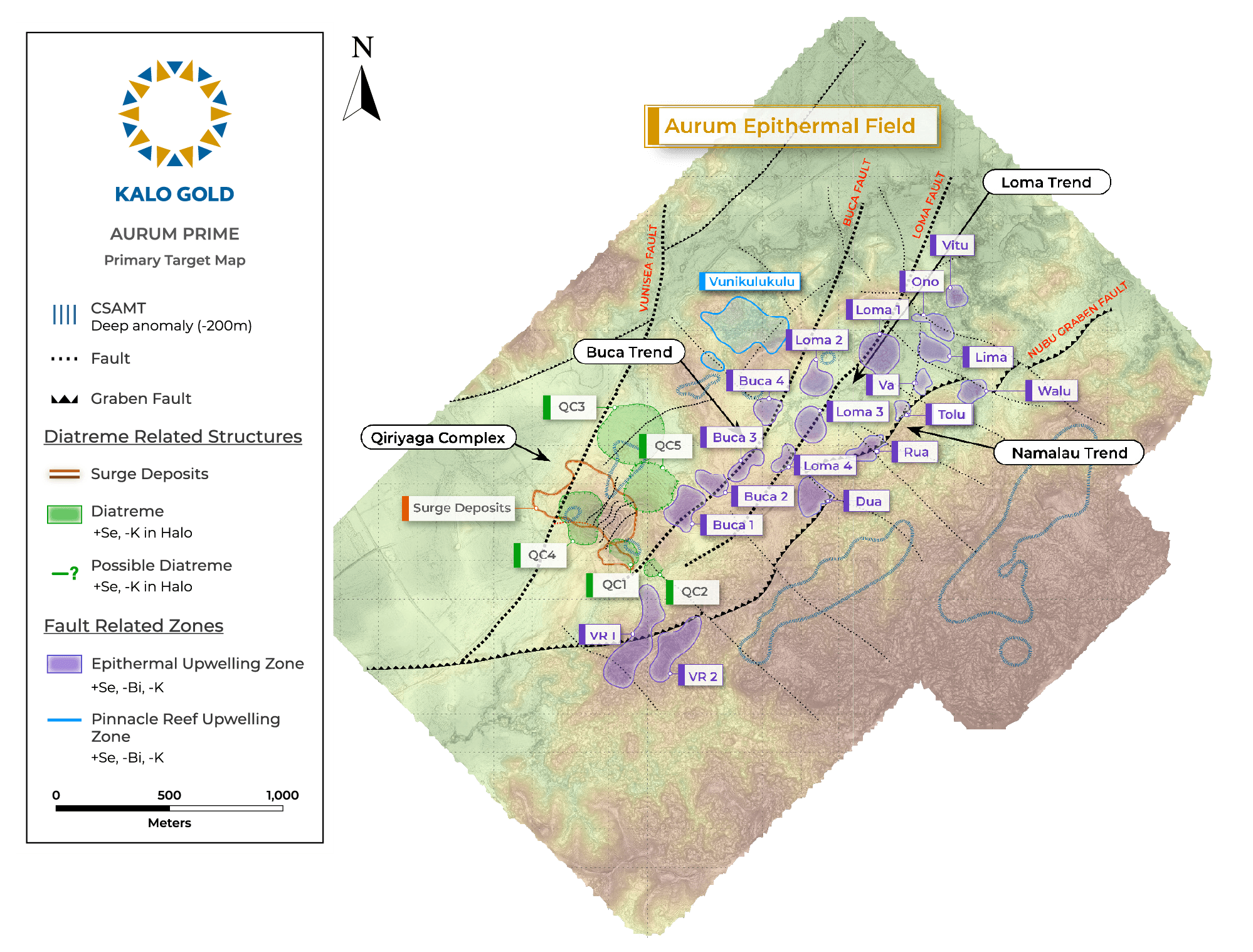 20 intact epithermal upwelling zone targets identified in the Aurum Epithermal Field (Namalau, Loma and Buca Trends) and five gold targets in the Qiriyaga Complex (diatremes and associated surge deposits)